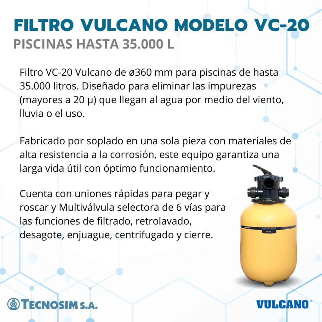 Filtro VC-20 Vulcano de ø360 mm para piscinas de hasta 35.000 litros. Diseñado para eliminar las impurezas (mayores a 20 µ) que llegan al agua por medio del viento, lluvia o el uso. Fabricado por soplado en una sola pieza con materiales de alta resistencia a la corrosión, este equipo garantiza una larga vida útil con óptimo funcionamiento.