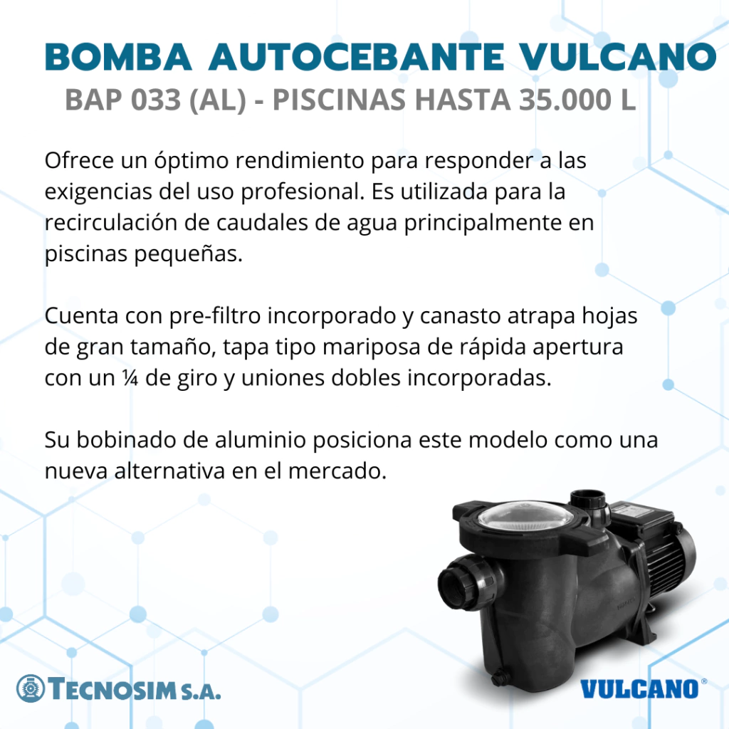 Bomba autocebante para piscina BAP 033 Vulcano. Ofrece un óptimo rendimiento para responder a las exigencias del uso profesional. Es utilizada para la recirculación de caudales de agua principalmente en piscinas pequeñas.