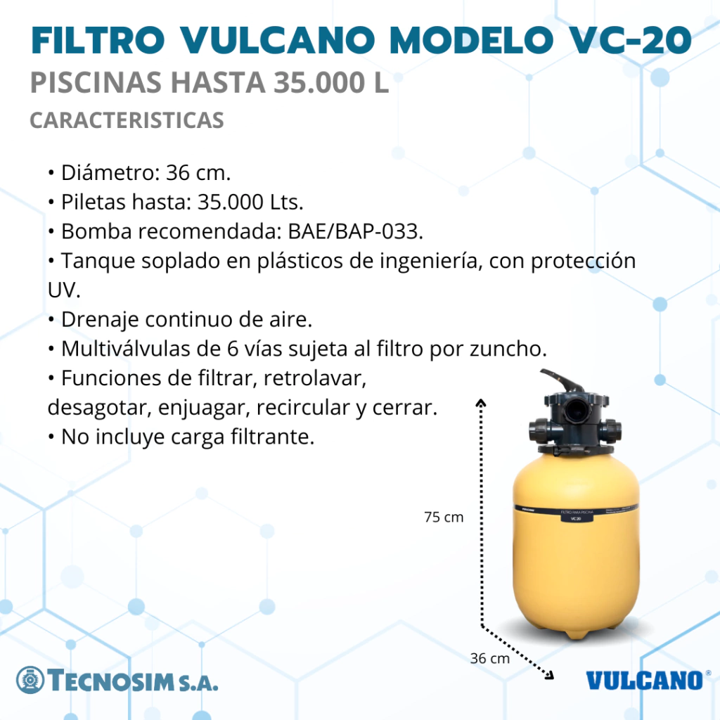 Filtro VC-20 Vulcano de ø360 mm para piscinas de hasta 35.000 litros. Diseñado para eliminar las impurezas (mayores a 20 µ) que llegan al agua por medio del viento, lluvia o el uso. Fabricado por soplado en una sola pieza con materiales de alta resistencia a la corrosión, este equipo garantiza una larga vida útil con óptimo funcionamiento.